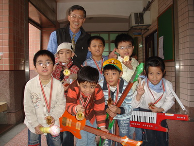 到了場外,再跟校長合照。校長果然很專注看表演,也注意到還有一個小朋友怎麼不見了 (一年級的小弟弟已經先跑回教室秀獎牌了),同時也說大家表演的很精彩,樂器做的很漂亮。