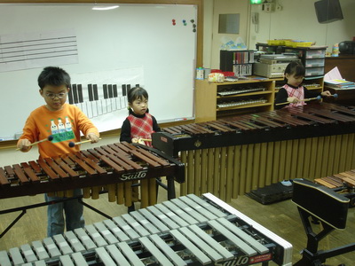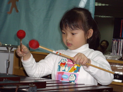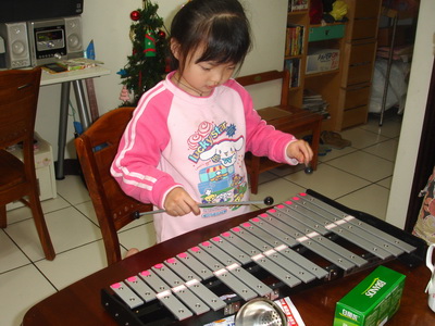 媽媽先用貼紙把鐵琴上的字母貼住,但因為鐵琴上的字母是用刻的,所以蓉蓉施展她的小聰明,會從側面,用銳利的眼睛隱約看出原有的字母。發現了這點,最後媽媽再貼一層,就完全看不出來了。練習沒有字母的鐵琴,和先前的習慣不同,當然也會經歷一些挫折,所幸媽媽用了大量的鼓勵,很有耐心地陪蓉蓉一次又一次的練習,終於也讓蓉蓉往前跨越了一大級 (老師也說要讓幼兒班的小朋友學會不看字母需要蠻長的時間)。