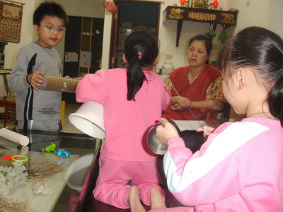 媽媽選出的第二首曲子是『地球朋友』,這是屬於小潔的曲子,都是簡單打擊的。曲子雖然簡單,但樂器的使用就特別了,要全部改用自製樂器來演奏。