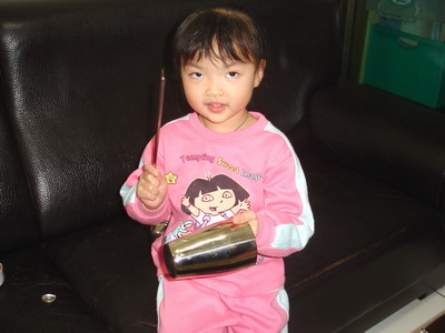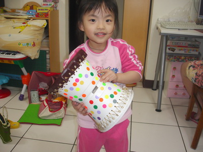 小潔把非洲鼓貼得花花的。