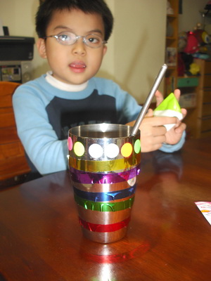 蓉蓉把金屬杯貼得亮亮的。