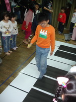 第一關是……(忘了),老師出題要小朋友去找答案。老師會先詢問小朋友的班級,依照不同等級給不同難度的題目。小潔的題目最簡單:數數看黑鍵有幾個?結果她一一走過,邊走邊數,123456,然後回來跟老師說:有 5 個。哎!