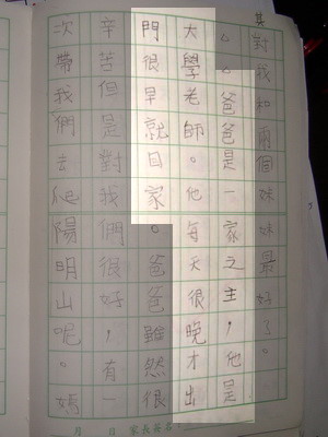 這一週的作業帶回家後,媽媽發現作文題目是『我的家庭』,範本的內容結構也符合現代的狀況,至少不會是我家門前有小河,後面有山坡般的夢中家園。媽媽先讀了原本的範本,再看看寶寶寫的,突然發出震耳欲聾的狂笑,寶寶和爸爸都被嚇了一跳,是寫了什麼這麼好笑?