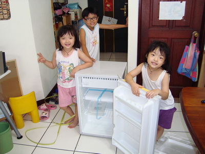 故事講完了,後續處理便是再買一台新的來用,否則餐廳裡的廚櫃會缺一個洞,這櫃子是爸爸針對那台小冰箱量身訂做,所以上網找到尺寸一模一樣的,剛好塞進櫃子裡。阿婆說,這台冰箱已經用了12年,是抽獎抽中的。平常都只冰飲料,小朋友三不五時都要從裡面拿飲料來喝,而爸爸開這冰箱門的次數,大概沒超過10次。