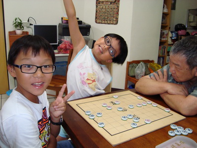 再次忍不住看這爺倆如此胡亂下棋,於是頻頻解釋規則,還得時時提醒走錯了,只差沒唱出歌來:『將帥不能王見王,士在九宮遛滑梯,相走田來馬走日,雙車橫衝又直撞,炮有炮架才能吃,兵卒向前不回頭』
