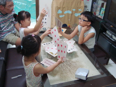 三個人都會玩撲克牌了,目前唯一會玩的還是抓鬼,只是小孩子都有輸不起的心態,所以玩到最後,常常都是『吵吵結束』。