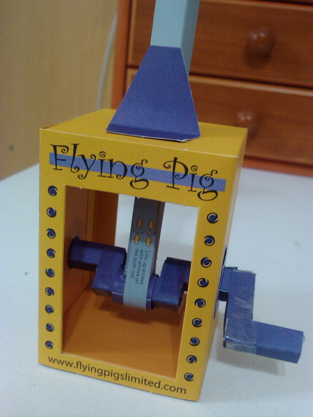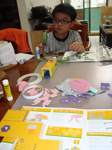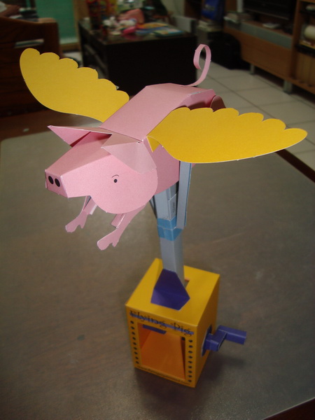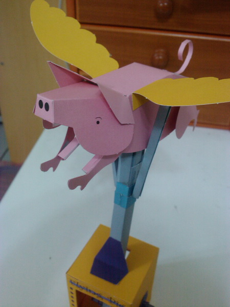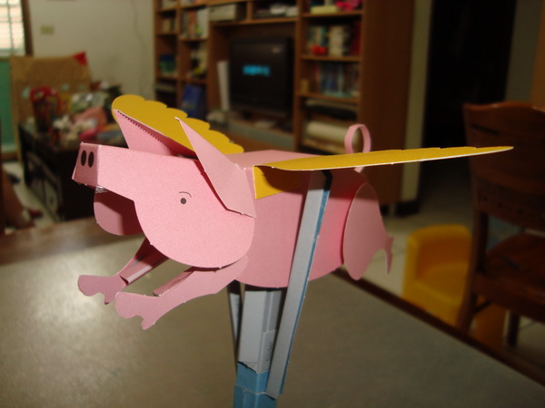 這套創意機械紙模型的公司,名稱是『飛天豬』,相當然爾,這一隻飛天豬就是招牌產品啦,自然不能錯過。趁著寶寶做暴龍紙模型同時,爸爸就來做飛天豬。