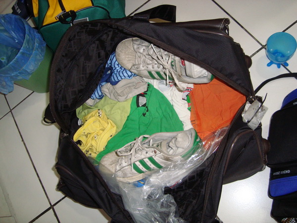 打開達哥的袋子,一堆髒衣服直接就塞在行李袋裡,而鞋子也沒用塑膠袋裝起來,就壓在上面,看著看著不自覺地就摒住了呼吸,應該還有肉眼看不見的煙不斷飄出。