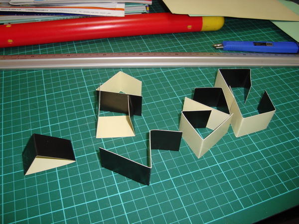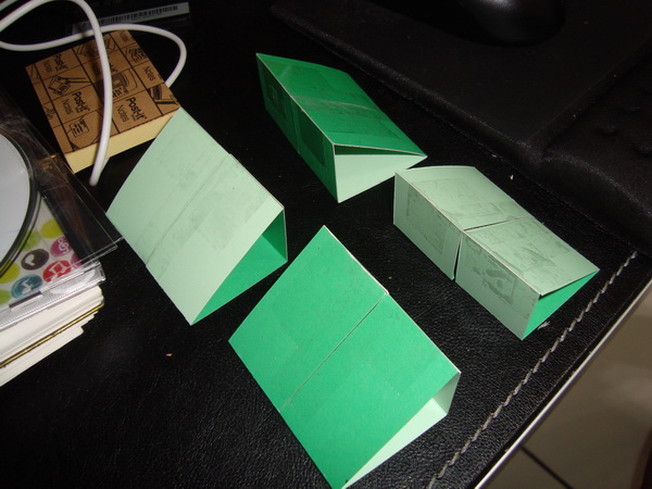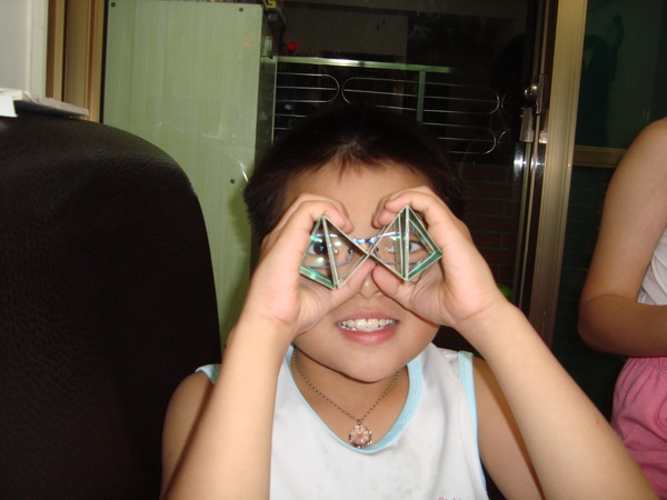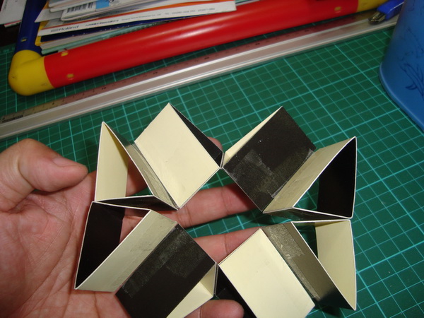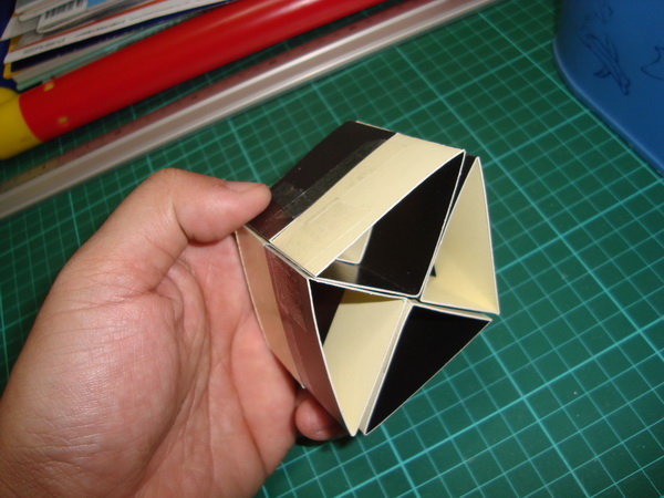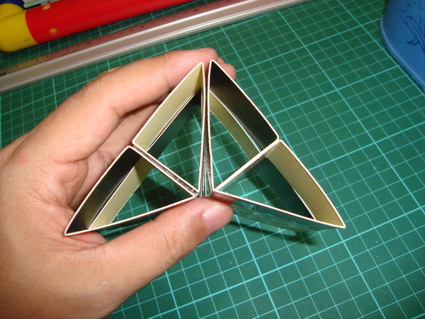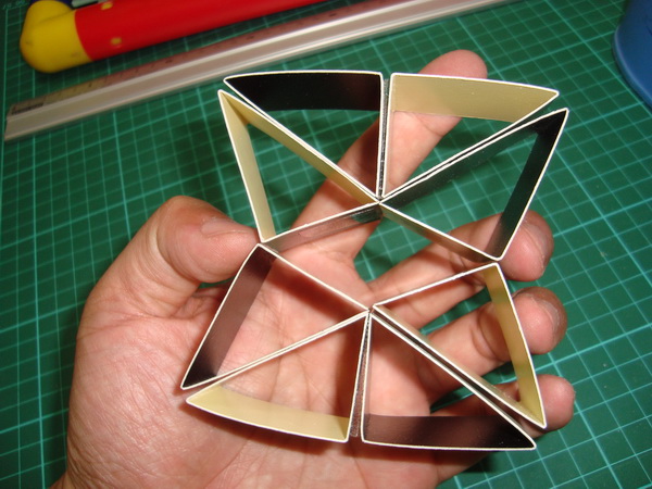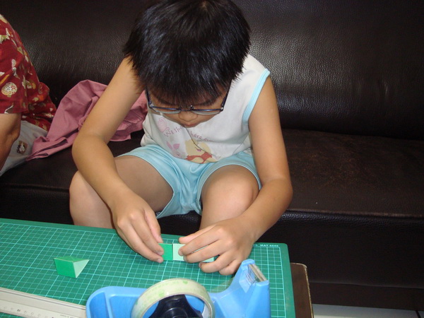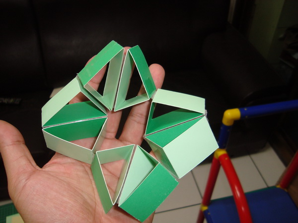 其實也不知道這個東西的名稱為何,不過做成正立方體造型的倒還蠻常看到的,這一個則為三角形的組合,較為少見,於是找寶寶一起來做勞作。
