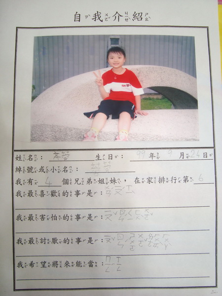 這樣的效果蠻好的,因為看到兩人在自我介紹裡寫的『我最喜歡的事』、『我最害怕的事』及『我最討厭的事』,和我們心中預想的答案並不相同,這也表示,讓我們有多一次的機會,了解孩子們心中對自己的認知。