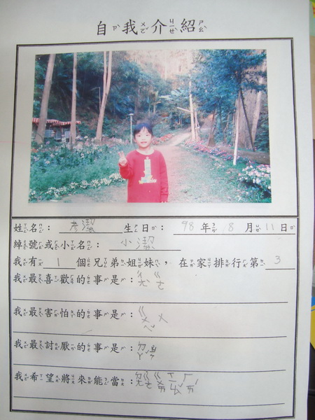 蓉蓉和小潔從學校帶了一張自我介紹的單子,而上面已經寫好內容了。記得之前寶寶是拿張空白紙回來,由我們填寫的,而今年則不同,是老師讓她們在寫校寫好,帶回來讓家長們看一看並檢查。