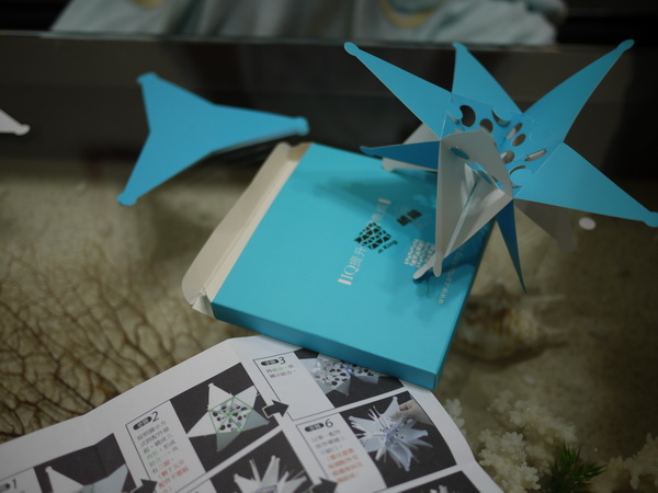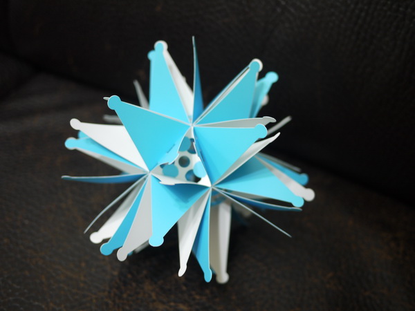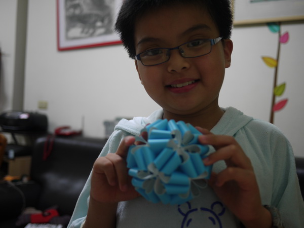 購自紙箱王的材料包 IQ Ball 系列 6,看顏色就知道這是寶寶選的,難度稍高一點點,不過看懂之後,三兩下就完成了。紙箱王這一系列的東西還蠻有趣的。