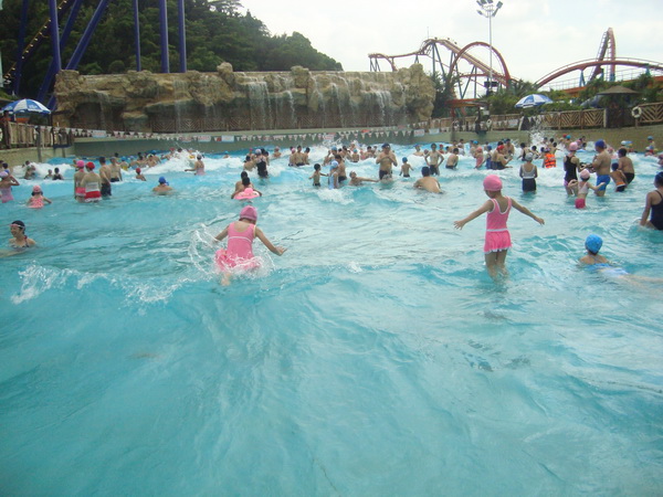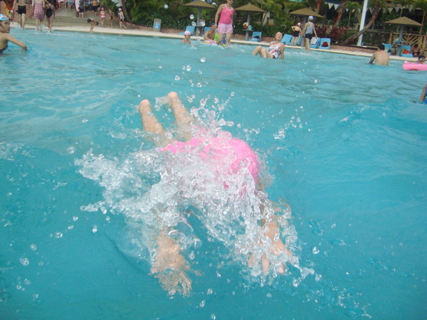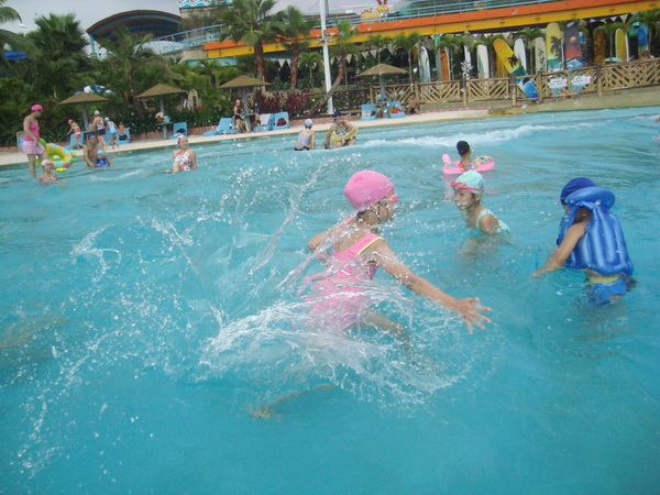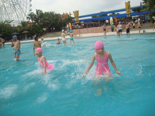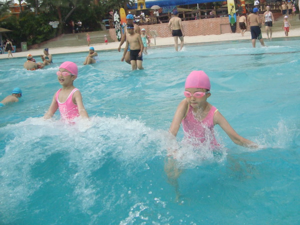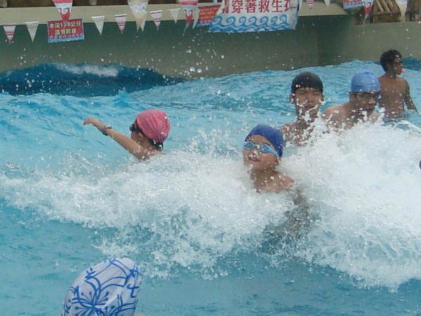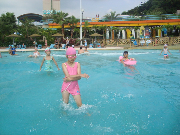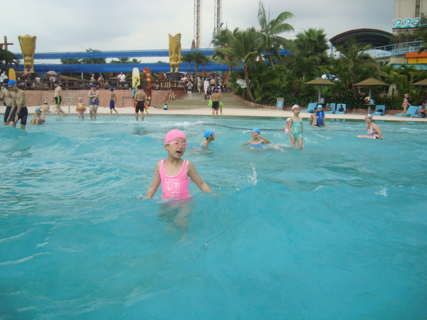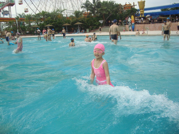 寶寶幾乎每一次起浪時間都不錯過,浪停後也不肯離去,在大泳池裡玩水。