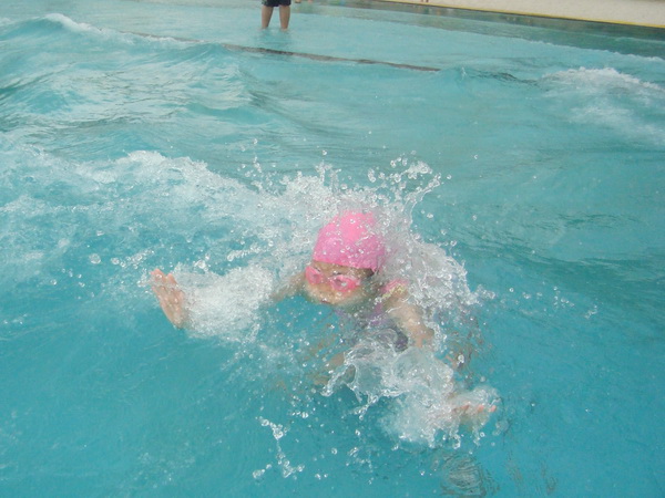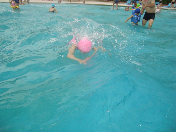 有時蓉會潛入水中踢腳打水要前進,愈踢愈後退。