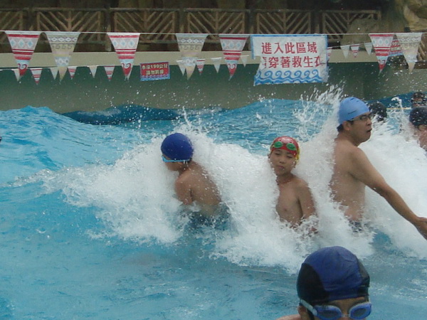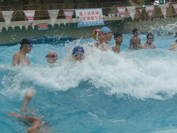 爸爸也陪著寶寶在最前面玩了幾次,著實累得不得了,有一次直挺挺地鑽進浪中,連泳帽都被沖掉了。