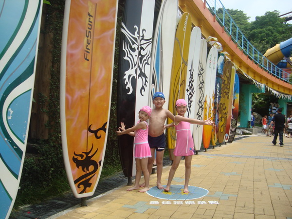 到水樂園的其他地方走走,一整排的衝浪板很有看頭,只是衝浪板沒有這麼大吧?!