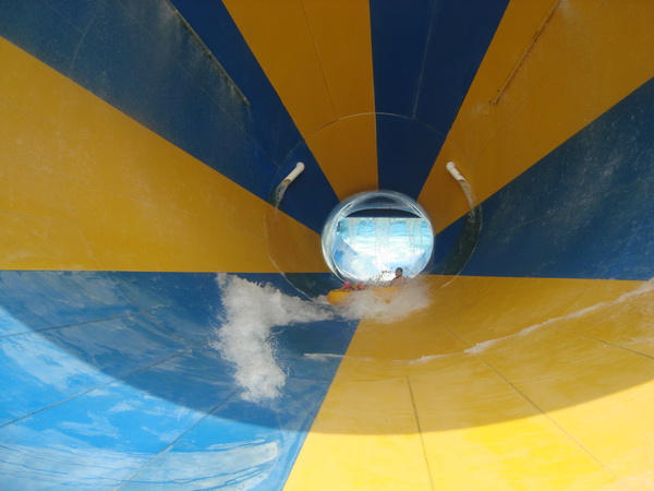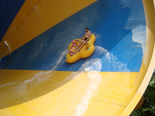 接著來到了『龍捲風』。它是二到四個人一組,乘坐大型的皮筏由上滑下來,看來很安全,爸爸一直鼓吹大家一同去玩。