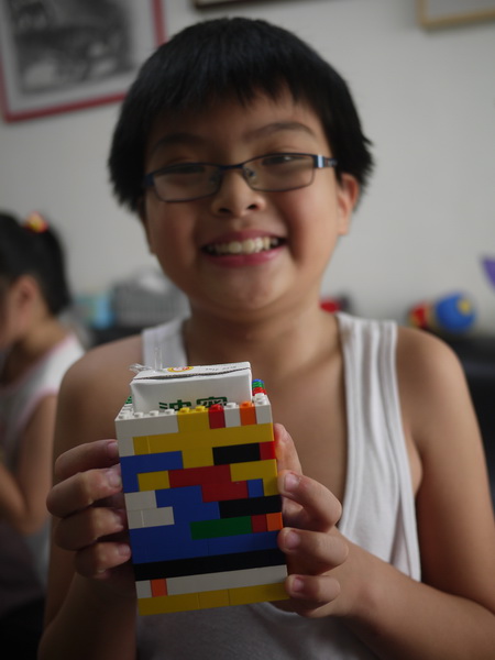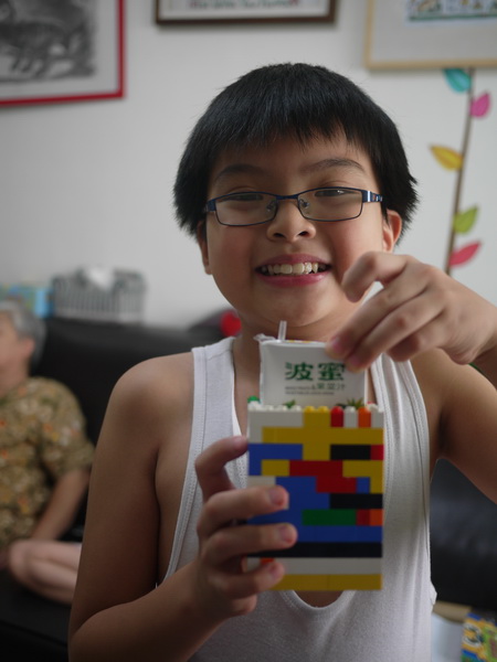 寶寶用樂高做個尺寸大小剛剛好可以裝入鋁泊包飲料的盒子,用這個來喝飲料,變得特別好喝。