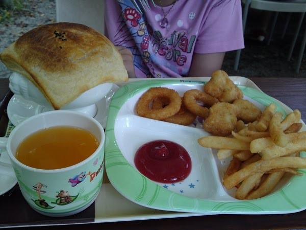 兩個小女生的則點兒童餐,想說她們愛吃酥皮湯,所以還選了有酥皮湯的兒童B餐,不過因為是南瓜濃湯,蓉蓉幾乎沒喝,小潔也喝得不多。兒童餐都是炸的,可能吃得有點膩了,蓉蓉說,下次可以不用吃兒童餐嗎?我回蓉蓉說,如果她能吃任何排餐,再貴都點給她吃,結果她一聽到都是?排,顯得意興闌珊。