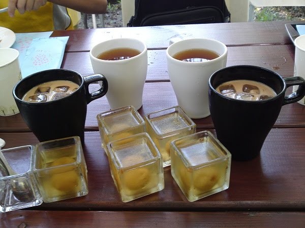 餐後還有飲料:白杯子的是冰花茶,喝起來就像茉莉蜜茶;黑杯子的是冰咖啡,還有甜點─梅凍。