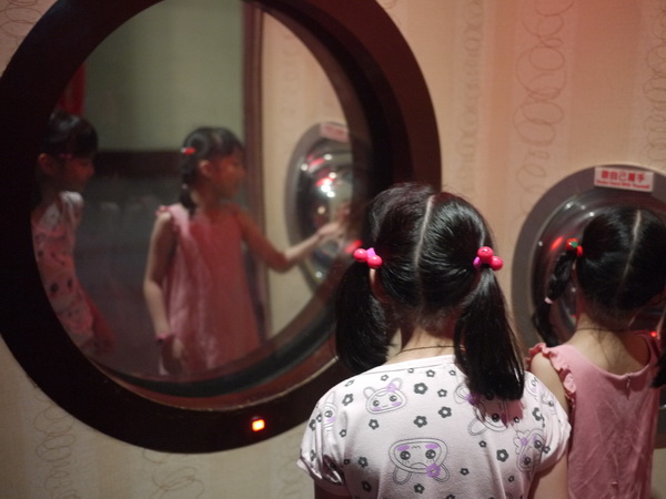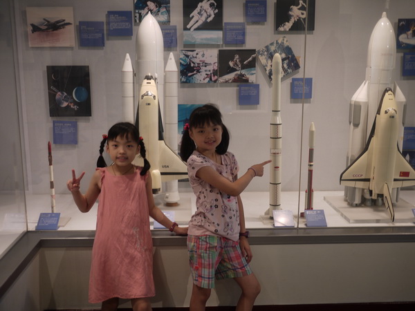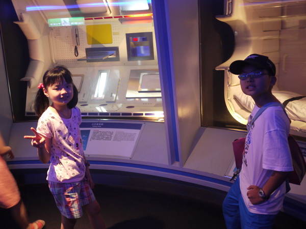 這是太空中的生活的設計,他們對臥室、廁所都很有興趣,看到實驗室,寶寶說實驗室很無聊。