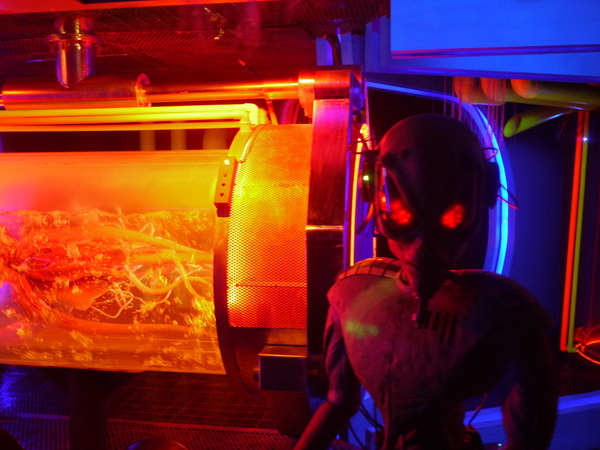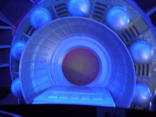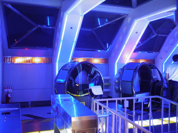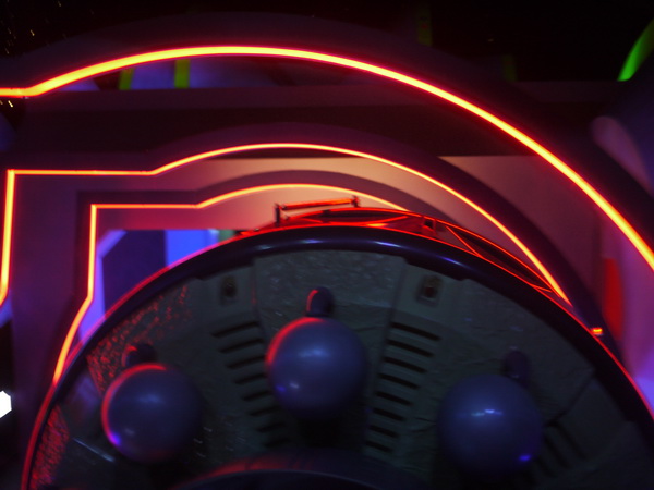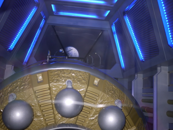 探險艙會緩慢地向前移動,偶而會轉個圈圈,不過從裡面看出去的影像會不斷地變,會有速度感,爸爸對旋轉的遊樂器沒輒,看得頭都有點暈了。