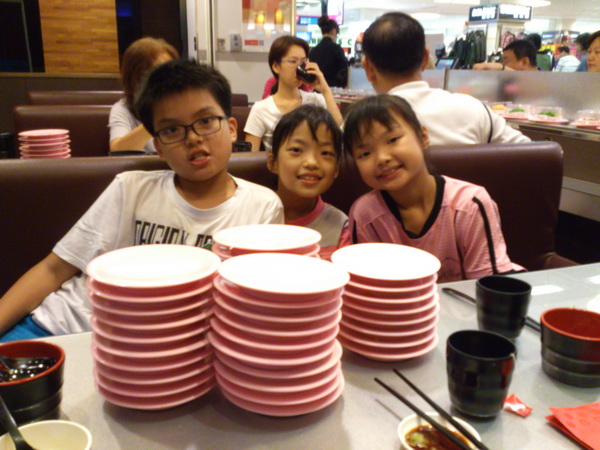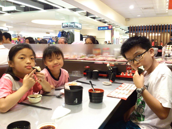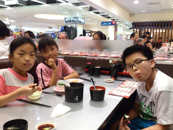 假日爸爸要上課,媽媽帶著三個一起去逛逛,吃壽司。