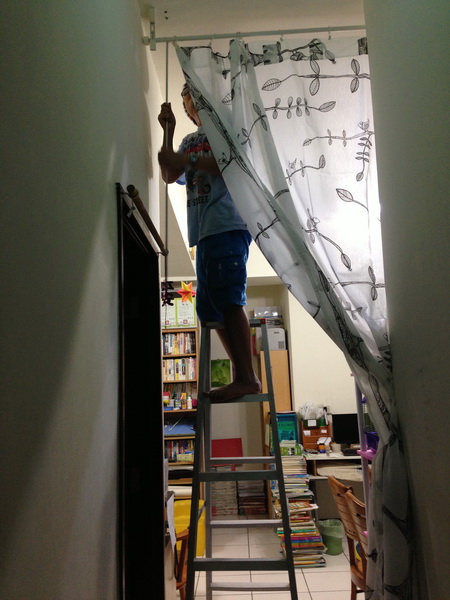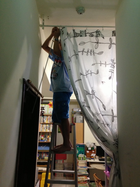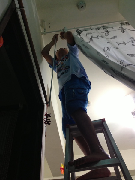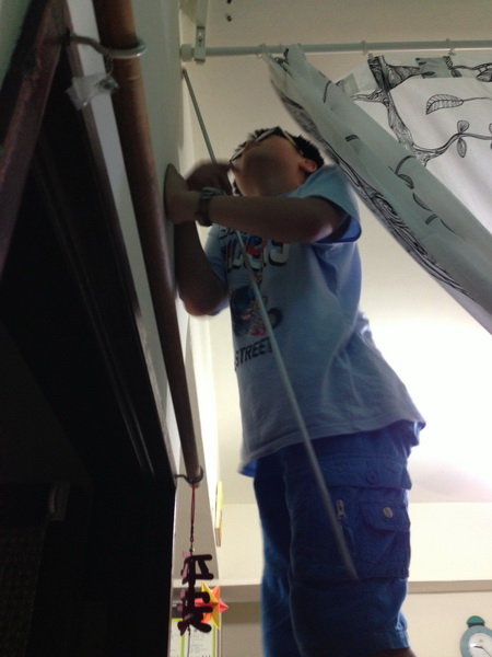 客廳隔冷氣的簾子因為很高,不太容易拉,所以裝了根長桿子,就可以很容易地拉動了。