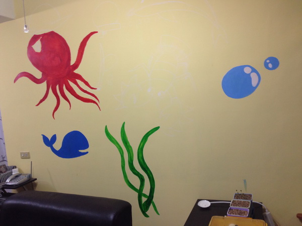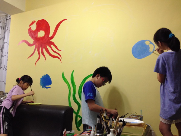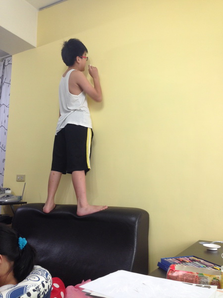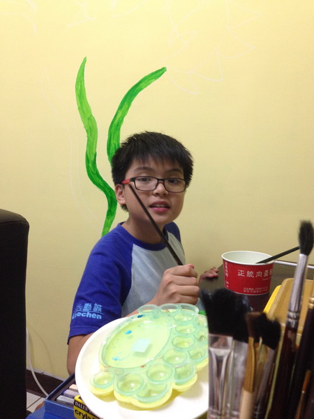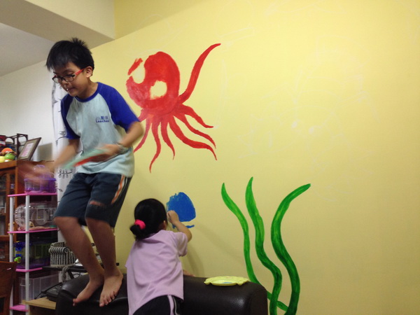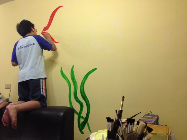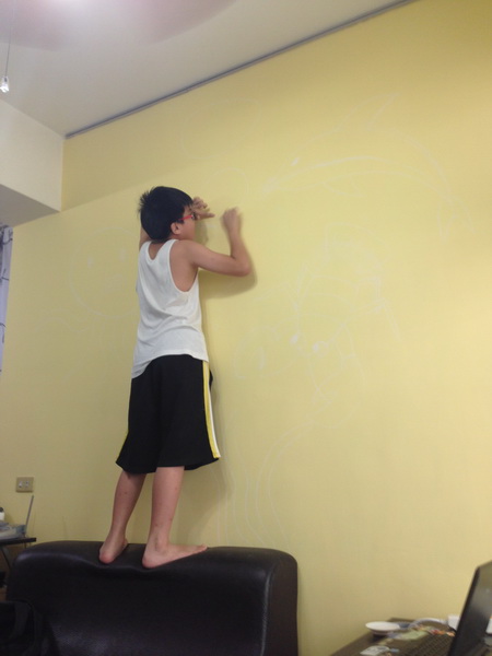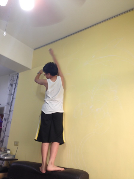 開始在牆上構思要畫什麼,問寶寶要不要先畫草圖。他說已經想好,直接畫就行了。