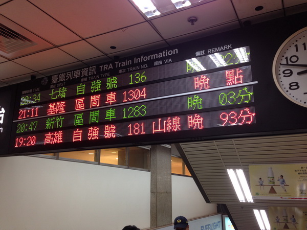 寶寶的野猴子夏令營在今天回家,偏偏正好碰上前一天蘇力颱風來襲,西部的鐵路也遭到災害波及,前一天因為火車停駛,導致這一天的排程大亂,誤點嚴重。原訂要在晚上七點抵達台北車站的,遲遲不見車影、人影。