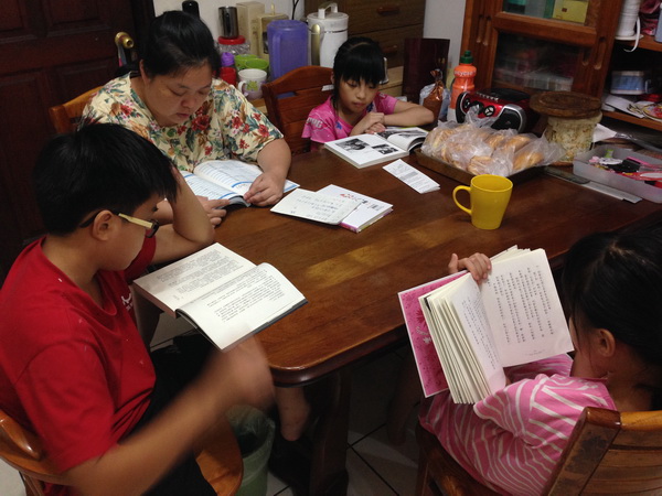 媽媽新定的規則,每天晚上要用一個小時 (後來改成半個小時,對小朋友來說,要撐一個小時難度太高了) 的時間,離開電腦、放下手機、關掉電視,全部的人都集中一起共同閱讀。