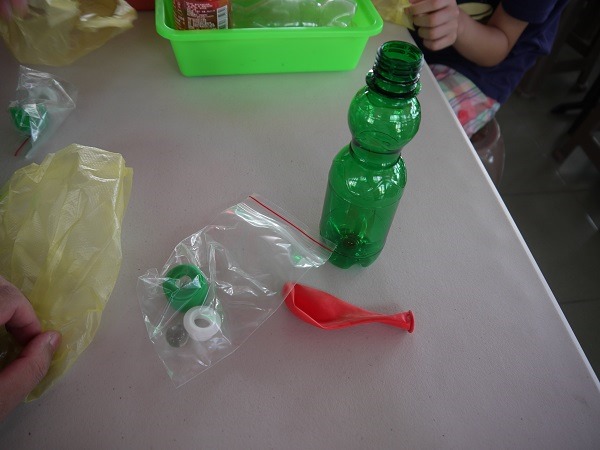 好,要準備DIY了,先檢查材料:空瓶、汽球、綠瓶蓋、白瓶蓋、彈珠,都有!