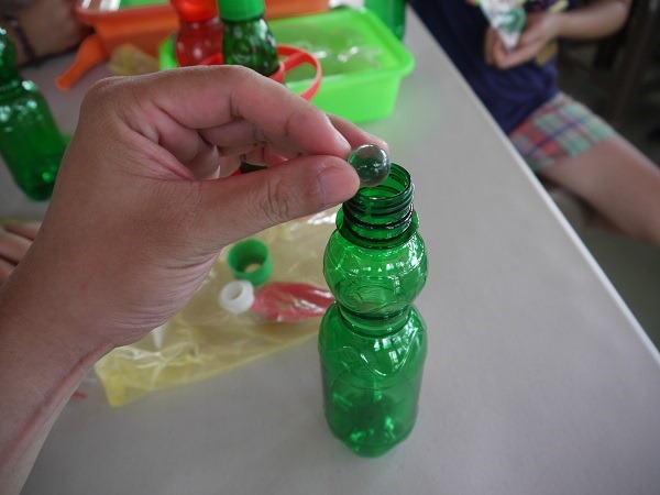 第一步:先把彈珠放進瓶中…
