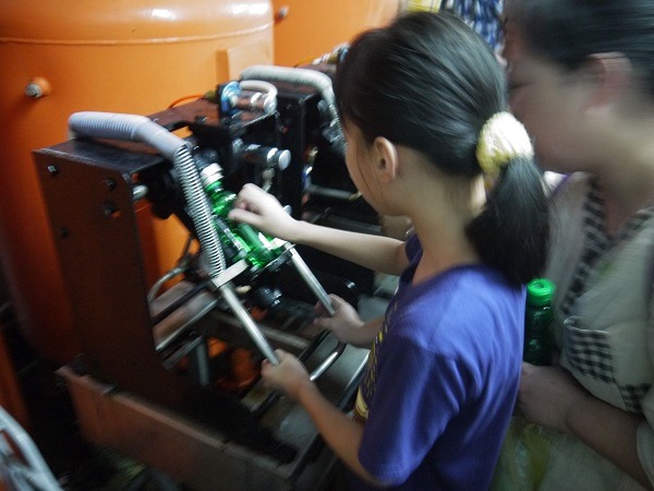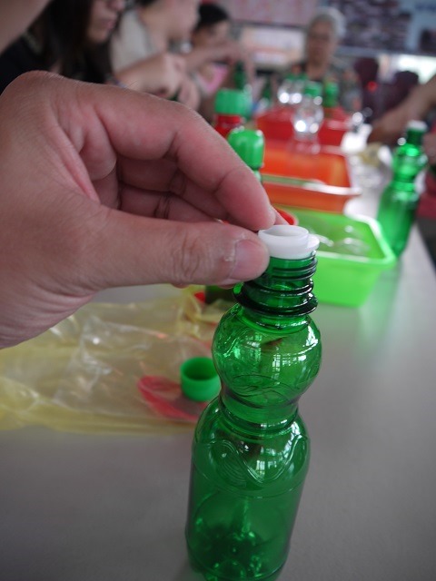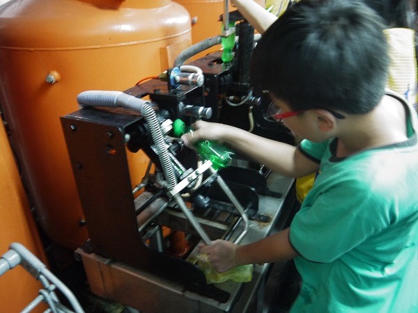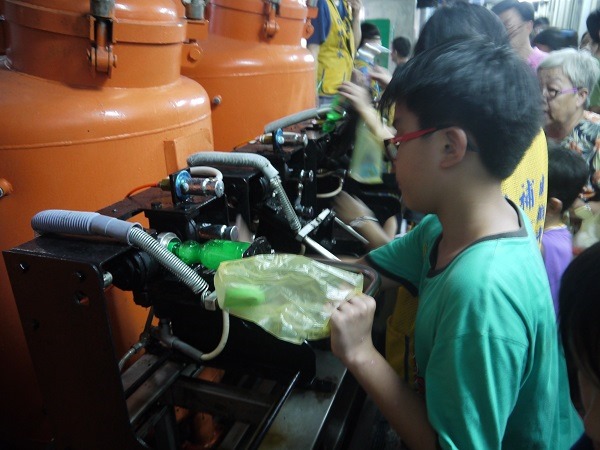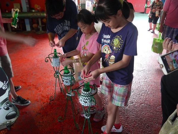 工作人員正在講解,還不時會有『有獎徵答,』答對的送彩色造型彈珠喔。我記得的是,彈珠汽水瓶蓋的開蓋方向與平常的相反,是因為怕小孩子打開拿出彈珠來玩、怕發生危險。