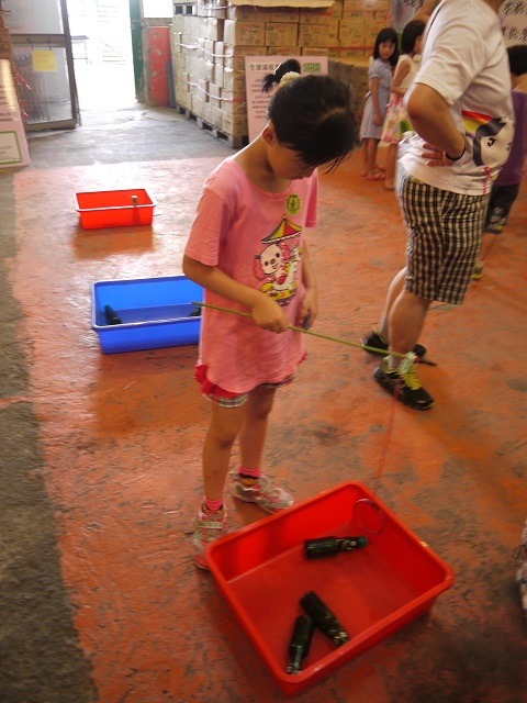 在影片開始之前,先前那位玩把戲的先生又出現了,又教了我們把衛生紙變不見的小魔術,同樣地,又把道具送給我們。接下來就是自由活動的時間了,自由活動時,寶寶就喝光、又再跑去裝汽水、喝光,再去裝…旁邊有這個銅囉體驗區,問題又來了,汽水跟銅鑼有什麼關係啊?因為工廠在銅鑼工業區內,哈~