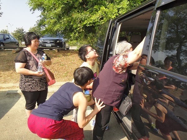 這是~~車太高,阿婆很難爬上去,需要兩位帥哥幫忙推屁股~~