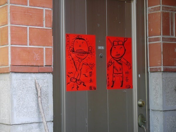 我記得我們以前唸書時的門神是秦瓊(秦叔寶)、尉遲恭,上學期聽到蓉蓉小潔講的是神荼及鬰壘,而且唸法很特殊喔,我不會唸,果然現在的門神和以前不一樣了,阿婆說做久也要換人做做看啦!