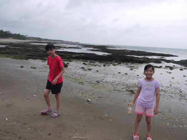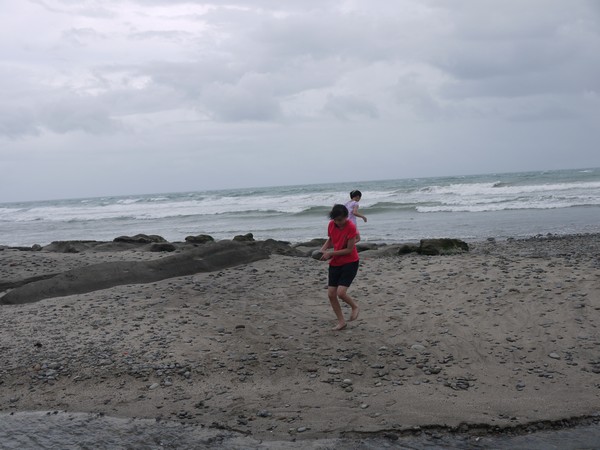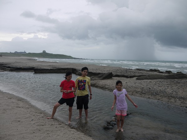 突然發現有了幾顆雨點打下來,趕緊喊著『要下雨了,撤離』,大家也很迅速地離開了海邊,因為到停車處還有一片砂地要穿過,這一路都沒遮擋的,孩子們也清楚雨說下就下,動作都很快。