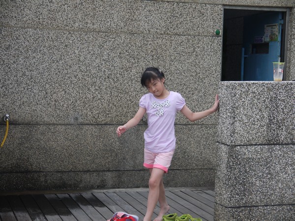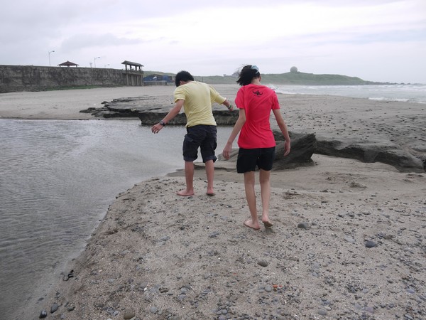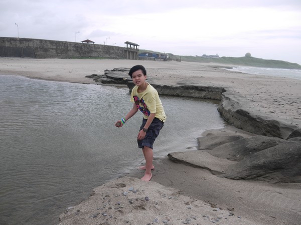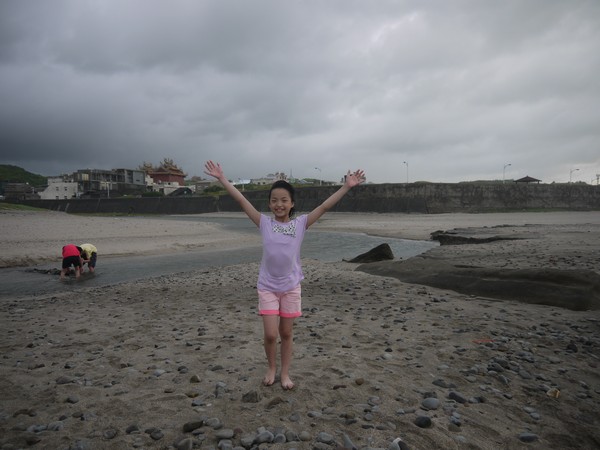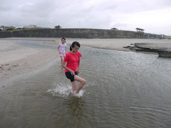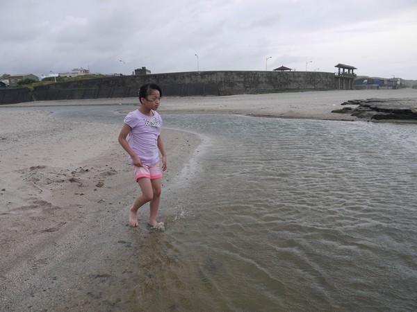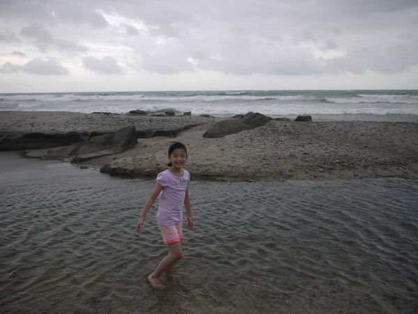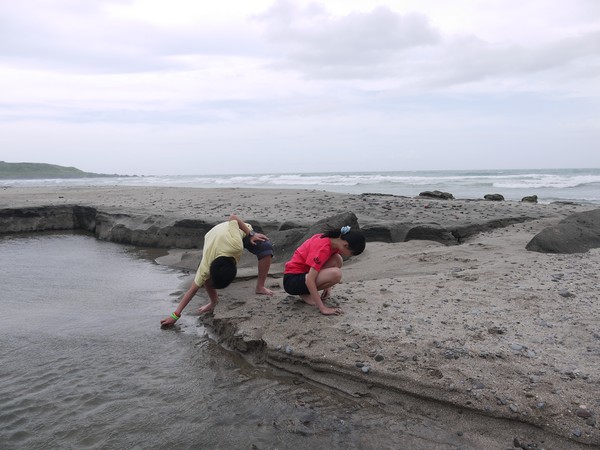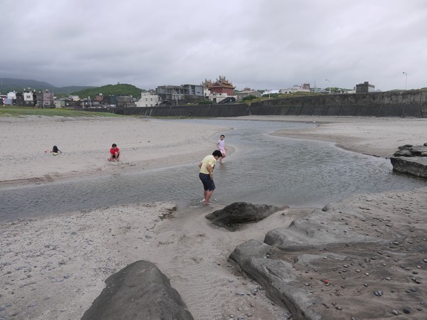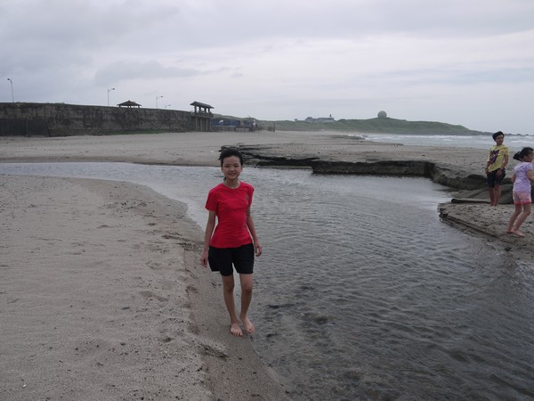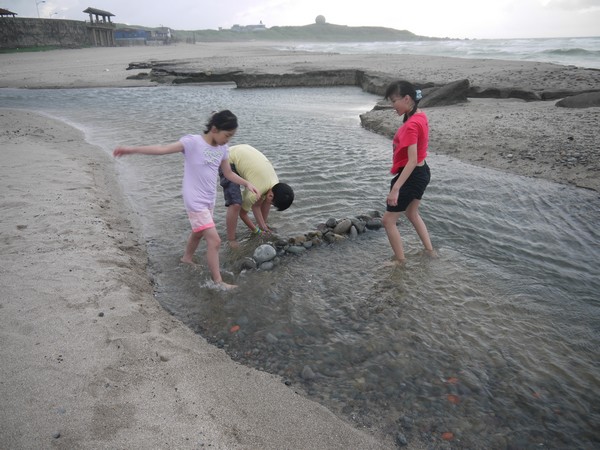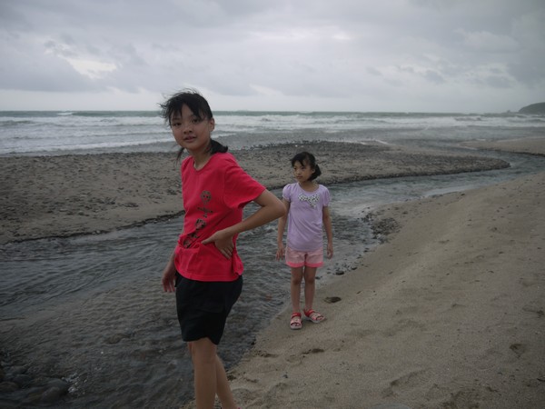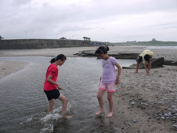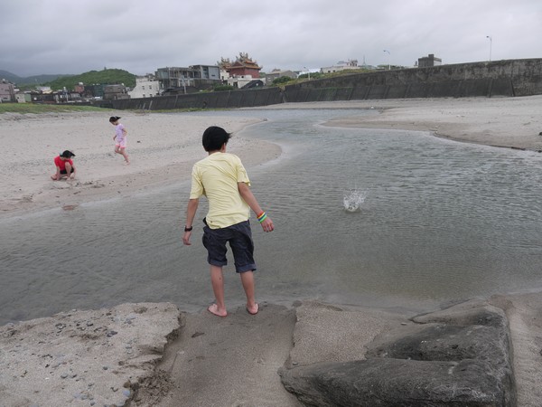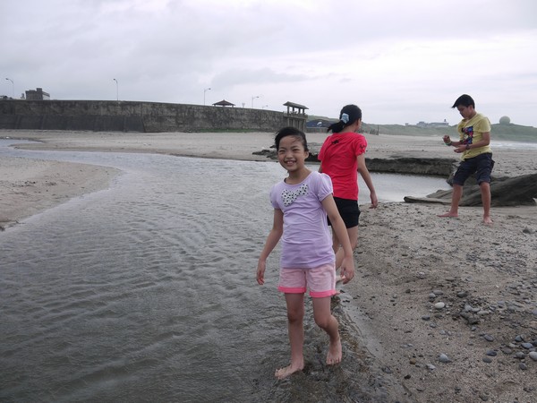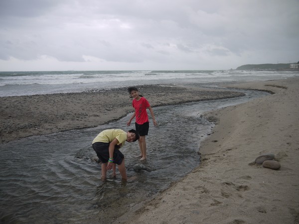 沙灘邊一條小河,水流急速,不過很淺,非常適合玩水。眼見安全無虞,很放心地讓孩子去玩,不過還是下達一項要求:衣服不淮弄濕。否則因為有準備換洗衣服出門,肯定又是整個人坐進水裡去了。