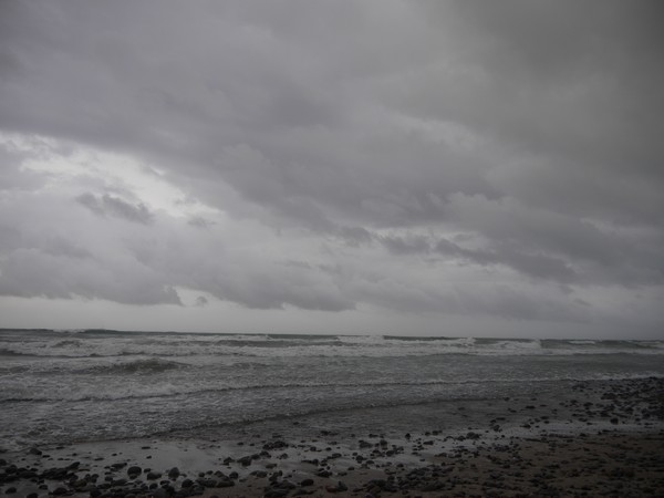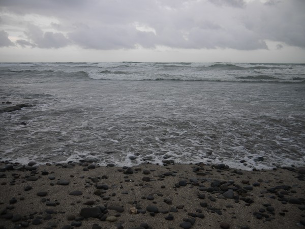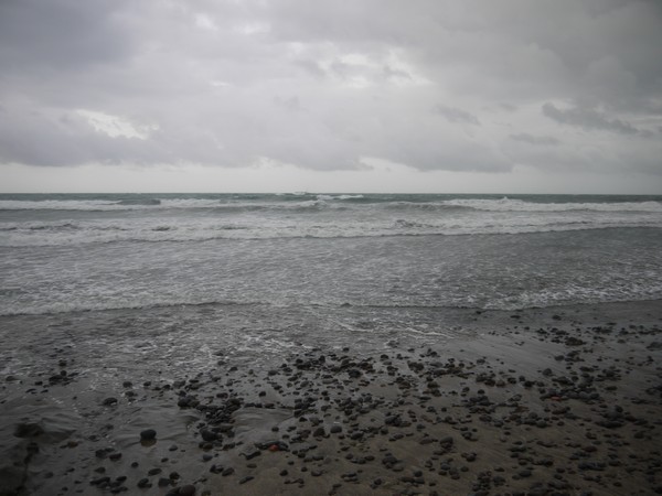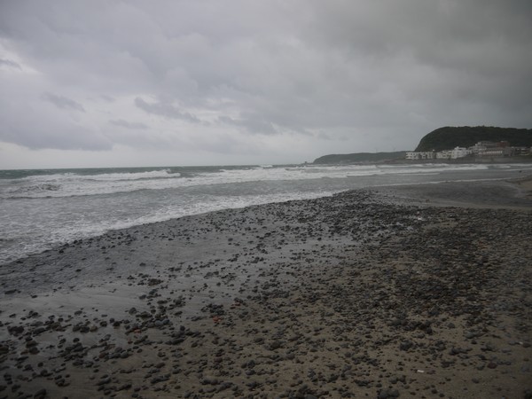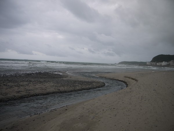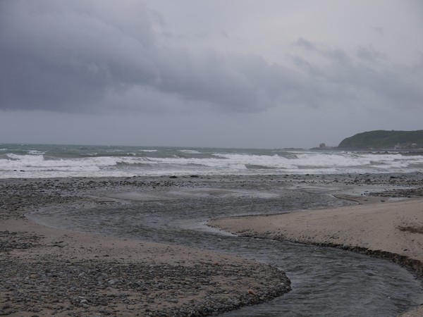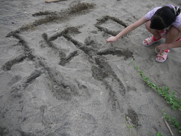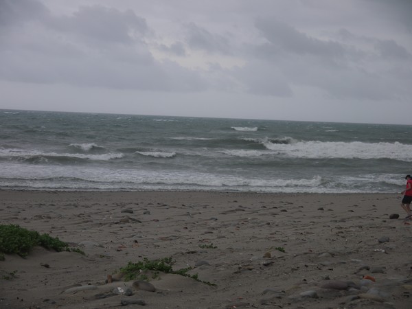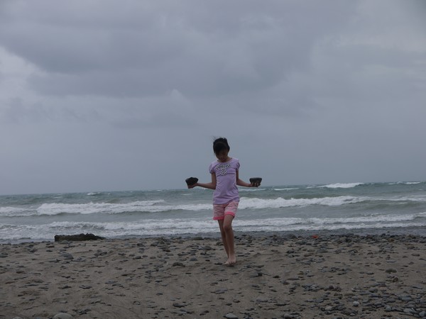 風非常大,被風吃起來的砂子,一粒粒打在臉上、腳上,很痛。上風處的人抬腳時,隨著鞋子上掉落的沙粒,吹飛到後面的人,就如同針扎般。難怪這時間沒有人到沙灘上來,我問寶寶:『颱風都要來了,浪這麼大,風這麼強,我們為什麼還來海邊?』他回答:『因為我們天不怕、地不怕』