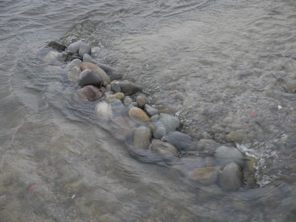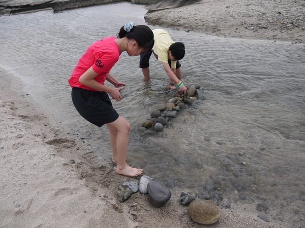 寶寶動手堆疊石頭,要築一道小水堤擋水,所以大家開始有了任務,分工去找較大顆的石頭來疊。