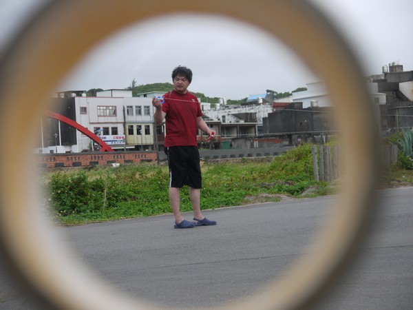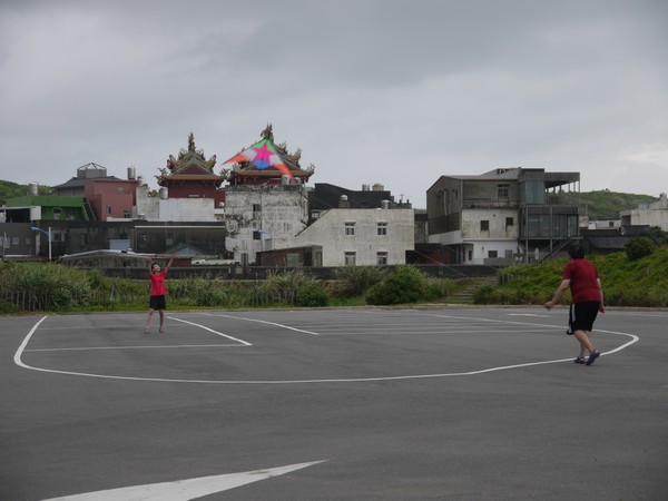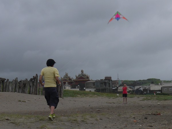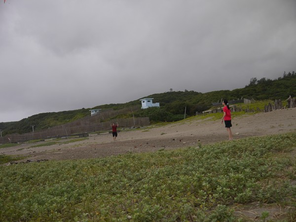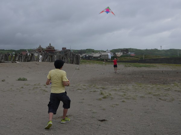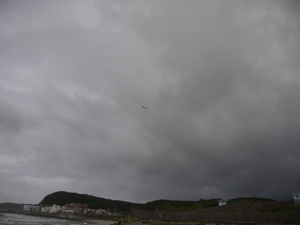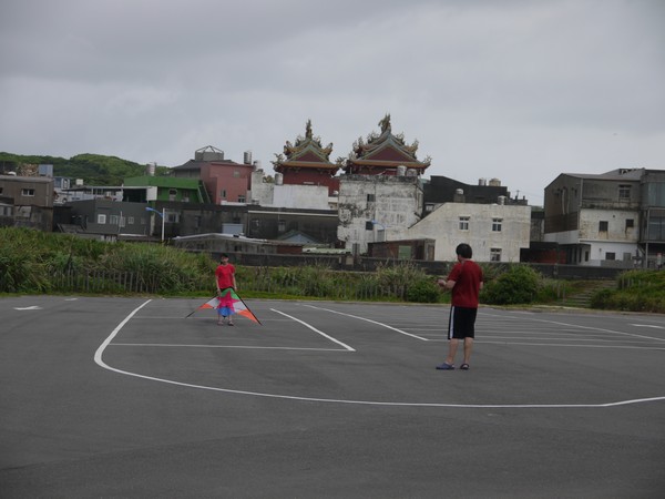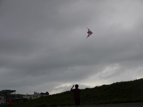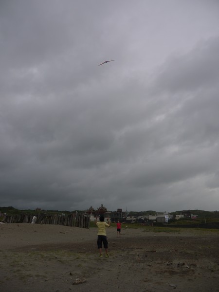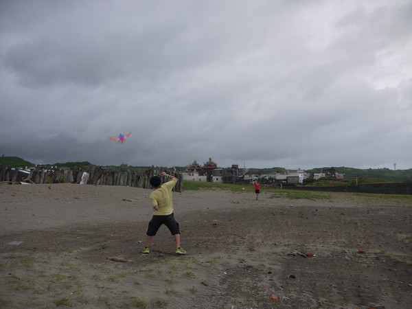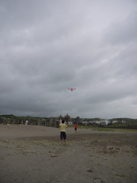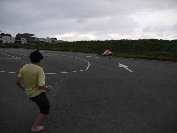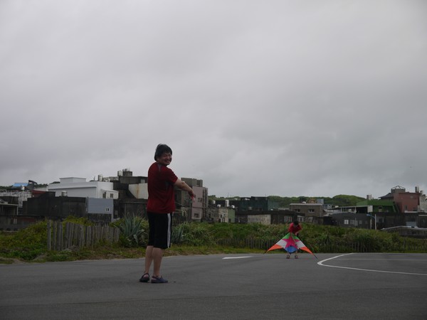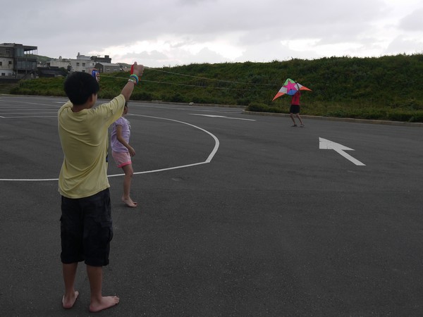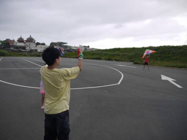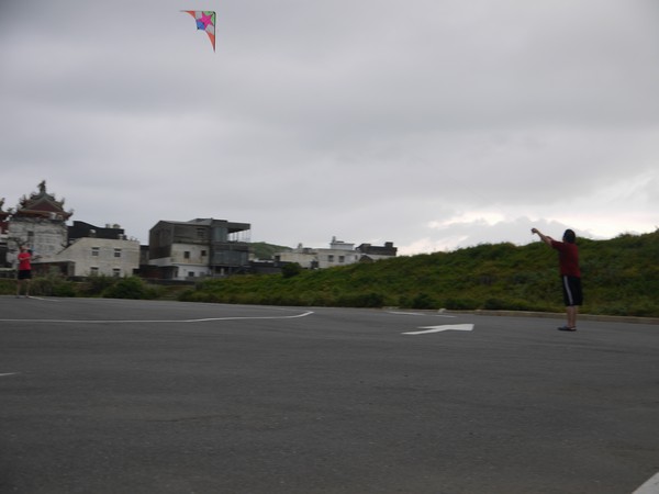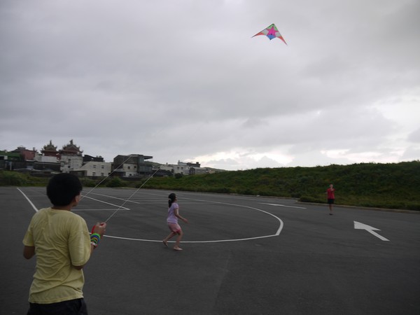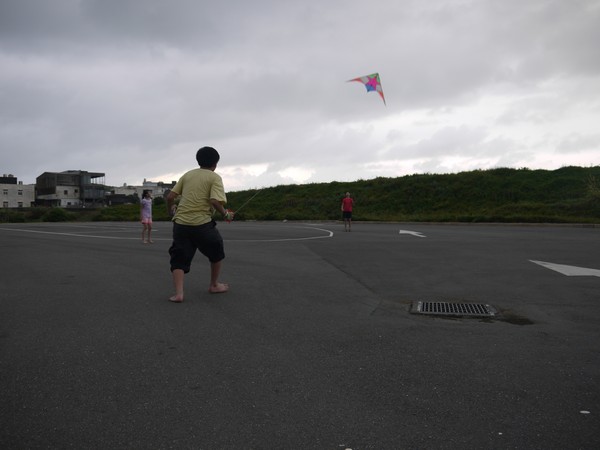 最後歸納出原因,是氣流不順暢,因為停車場周圍都有較高的土堤或建物,所以等同是一個谷地,才導致飛到稍高處就完全無風無力。於是決定再到堤外的海邊去試一試 (事實上,石門風箏廣場的風箏活動,也都是在沙灘上)