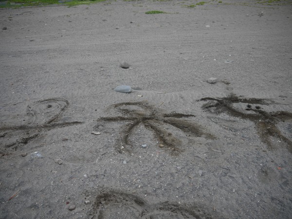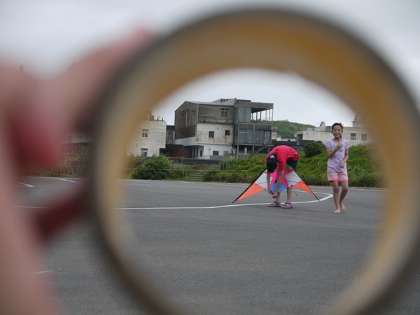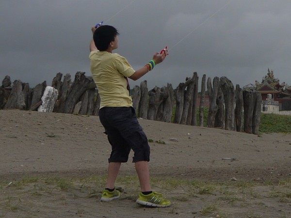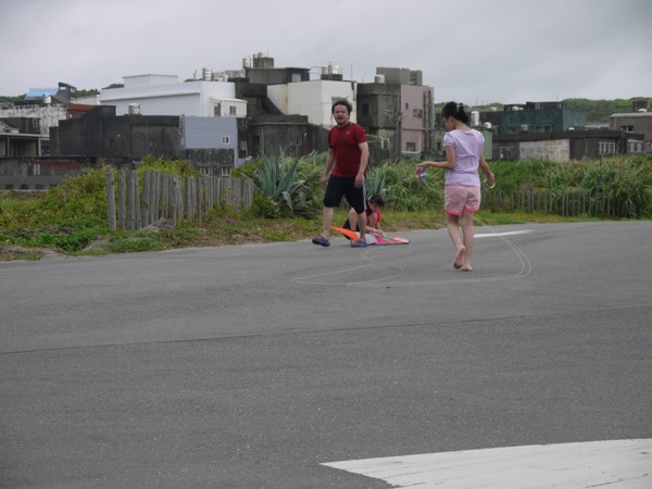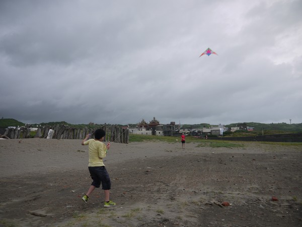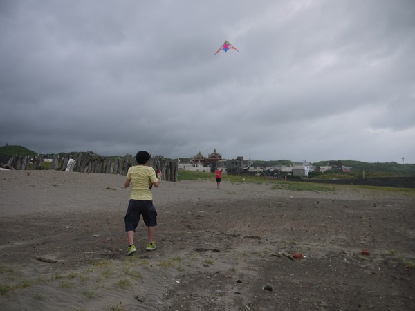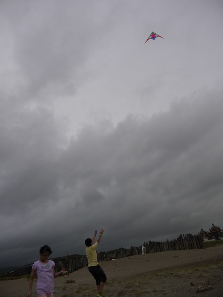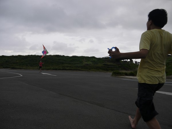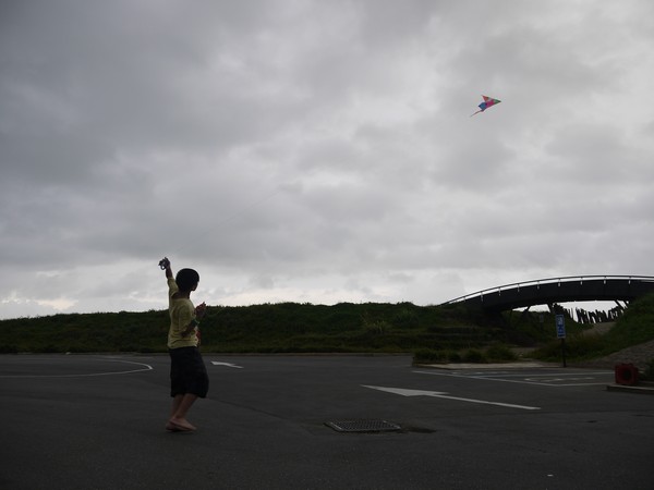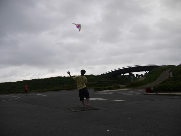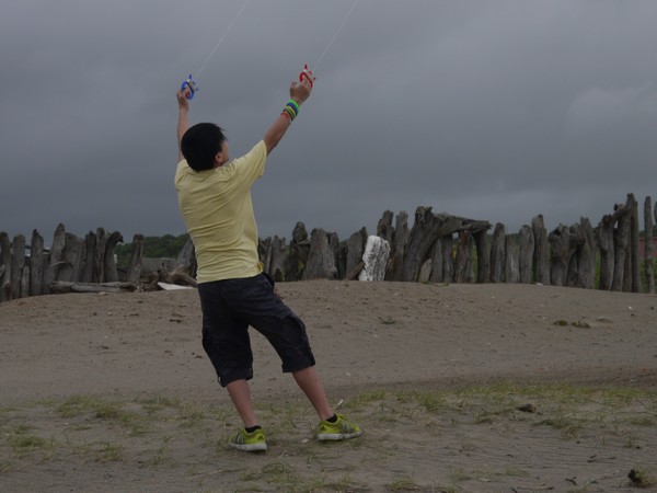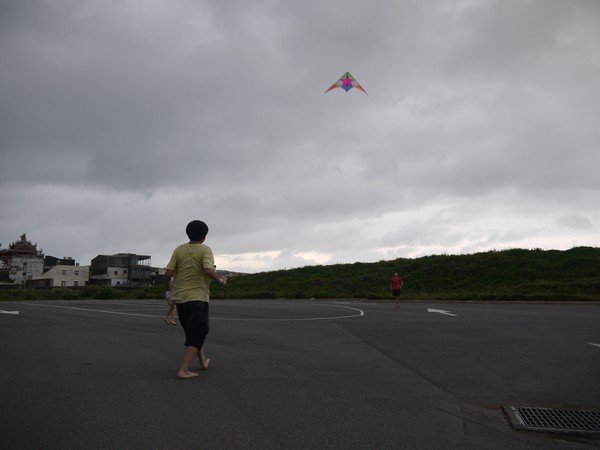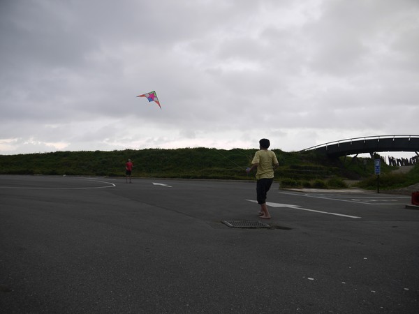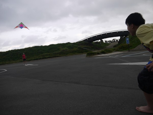 把手腳上的砂洗一洗,雨勢也停了,正好閒坐著晾乾。爸爸看看停車場內僅存的一兩台車都走了後,提議把技術風箏拿來放,正在組裝時還有兩台警車駛進停車場,原以為是要被驅離了,結果他們大概只是巡邏經過而已。