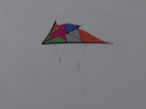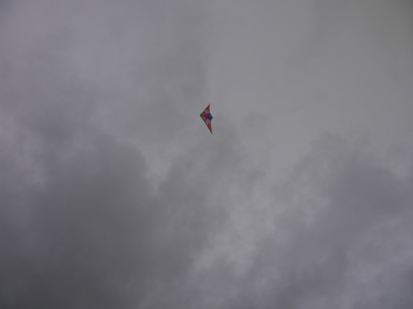 風很大,線一往後拉,風箏立即就飛上去了,不過還沒學會控制,只一瞬間,它又墜落。每次落地後,大概就有一、兩根傘骨需要重新固定,糾纏的線也要再次整理,最後還找出車上的膠帶來做固定。
