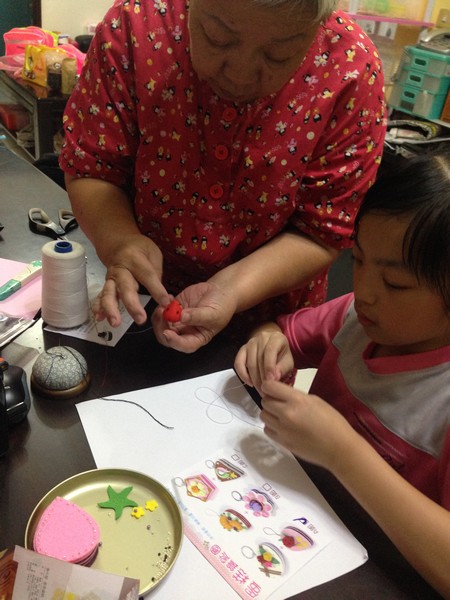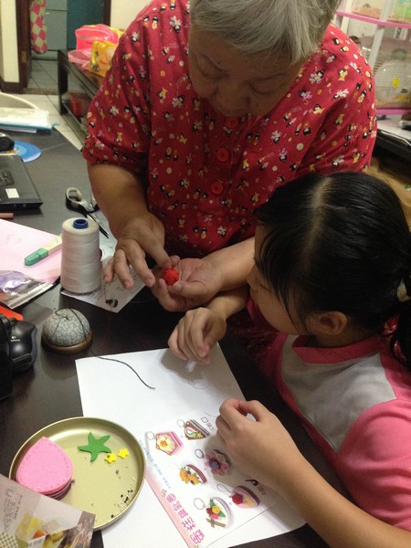 小潔拿出手工藝材料包來做,阿婆教她該如何縫。