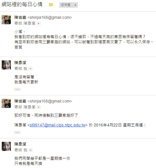 小潔每天都會在自己學校的網站裡寫日記,不過今日寫,昨日就清掉了,走過而不留痕跡,有點可惜,所以新增帳號,小潔也是三寶家庭網站的寫手之一了。