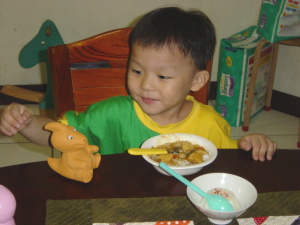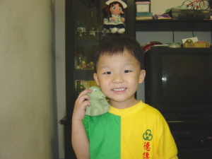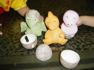 這三隻恐龍是大寶的爸爸買給三個小朋友的玩具,它們的下場是:二小時之後,一隻頭斷了一半;一隻整個頭被拔掉;僅存的一隻就被收到櫃子裡了。